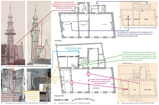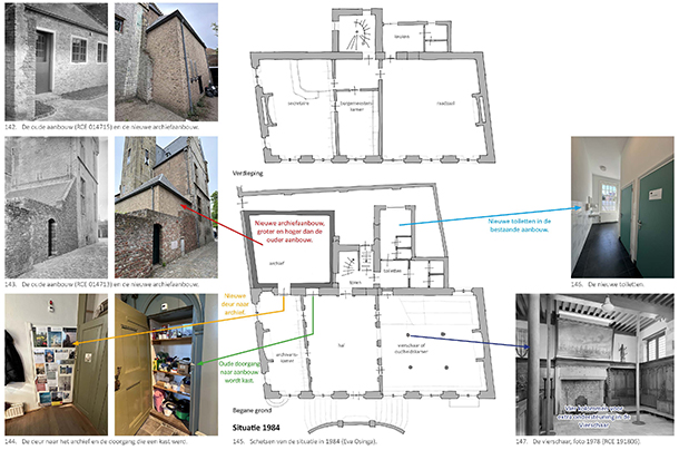 De achteraanbouwen werden vrijwel geheel opnieuw opgetrokken. De trap in de rechteraanbouw werd verwijderd en deze werd ingericht met een archiefruimte op de begane grond en een toilet met voorportaal op de verdieping. De deuren naar de raadzaal werden verplaatst.
